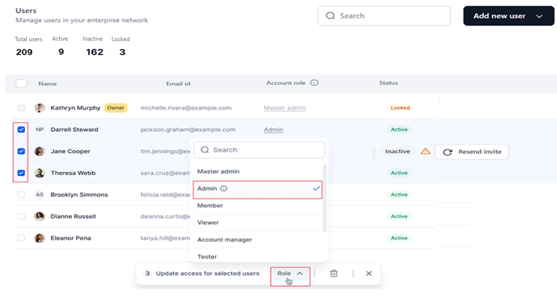 On the Users dashboard, you can change the account-level role for one or more users. Only the role allowed for the user type (admin or account) can be assigned.