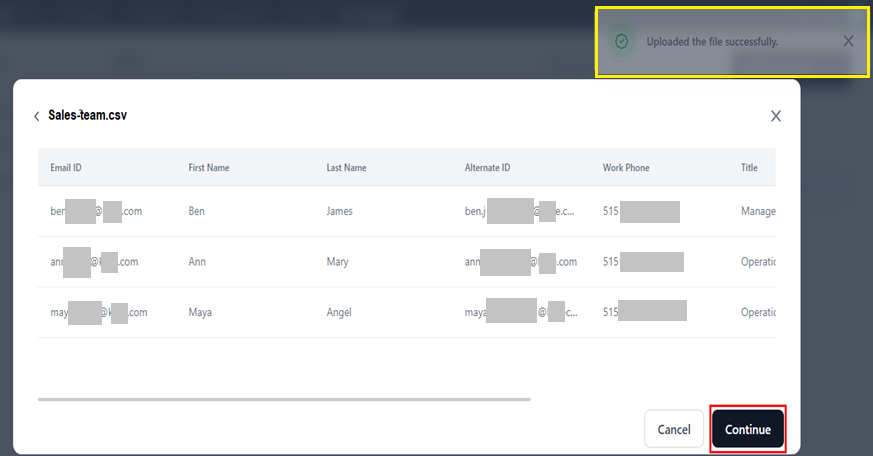 A preview window displays the file’s data with a file uploaded success message. Click Continue to import the file.
