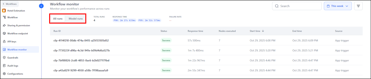 All runs: It shows comprehensive data on all workflow run instances and provides a comprehensive record of all the endpoint calls made to the workflow.