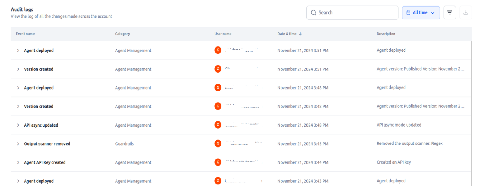 Audit Logs provides full visibility into user actions and system interactions, tracking logins, role changes, and model updates through dynamic time-stamped logs and tracking capabilities.