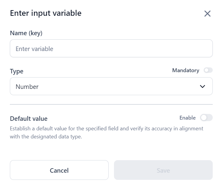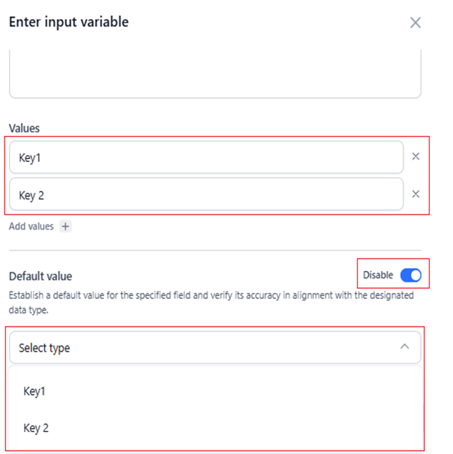If you select the Text, Number, or Boolean data types, the Default value field appears. You can enable the Default value field to set a default value for the input variable.