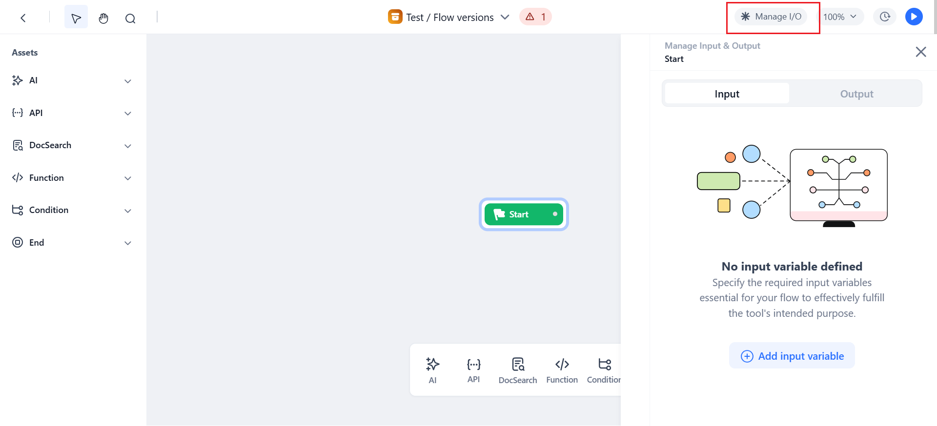 On the top of the Workflow canvas, click the Manage I/O button. Alternatively, you can click the Start node. The Manage Input & Output dialog is displayed.