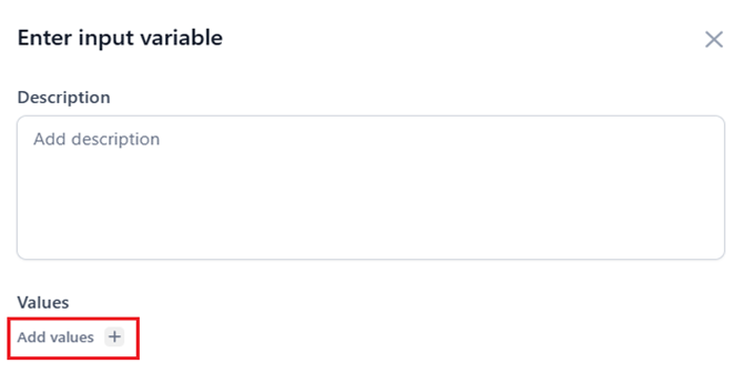If you select the List of values (Enum) data type, you can set predefined values that are allowed for tool input variables by clicking Add Values +.