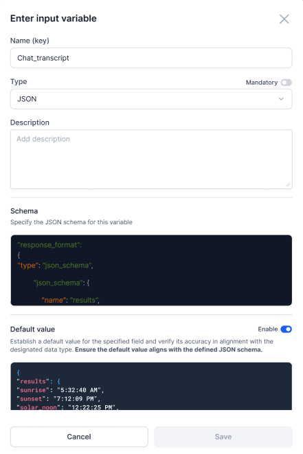 In the Default Value field, set a default value for the specified field and validate it against the designated data type, ensuring consistency with the defined JSON schema. You must ensure that the default value matches the schema you’ve defined. If the JSON is invalid, the system will display the relevant error message and execution will fail.
