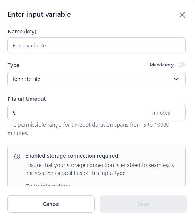 If you select the Remote file data type, the File url timeout field appears. Enter the File URL timeout duration in minutes. The default File URL timeout is 5 minutes. You can set it to anywhere between 5 minutes and 7 days (10080 minutes).