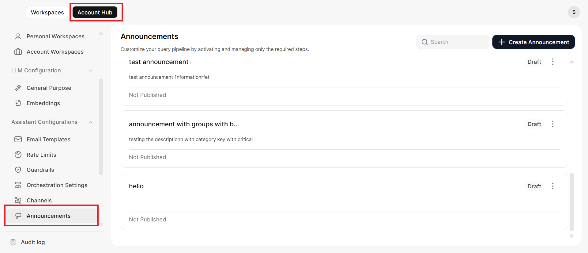 The Announcements feature in the Admin Hub under Assistant Configurations allows administrators to create, manage, and publish organizational messages. Announcements appear as banners at the top of the user interface, ensuring important updates are delivered in a clear and timely manner.