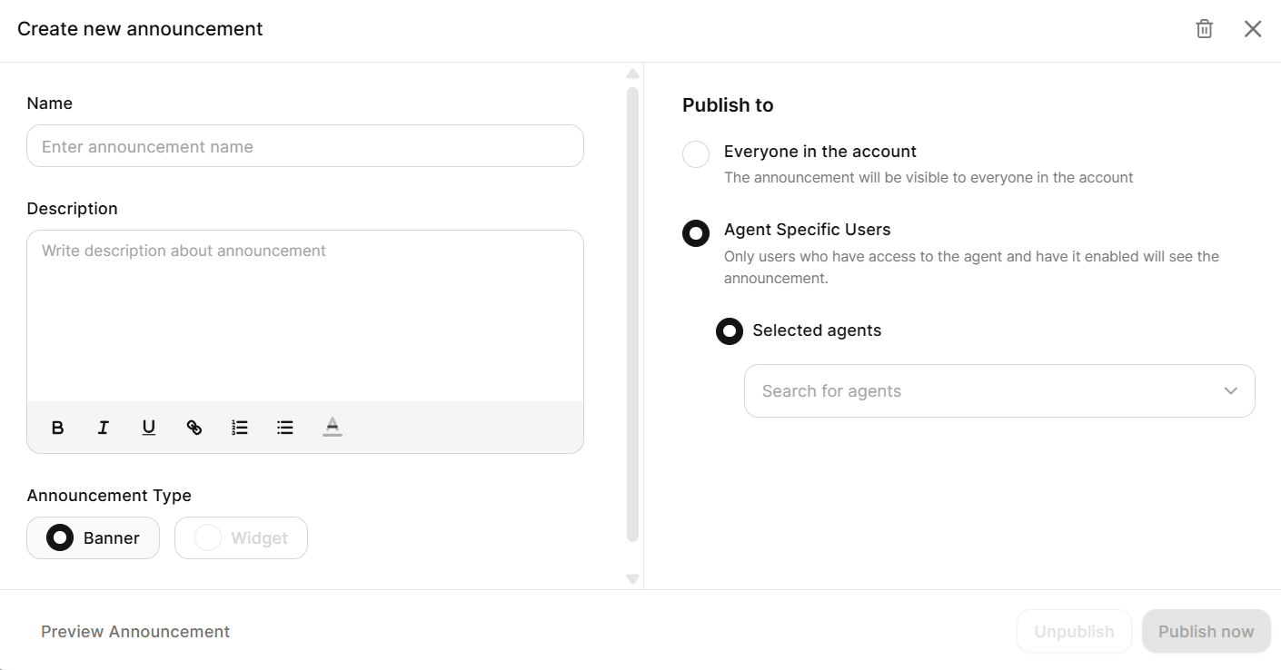 - Publish – Make the announcement visible to the selected audience. (Enabled only when Name and Description are provided.)