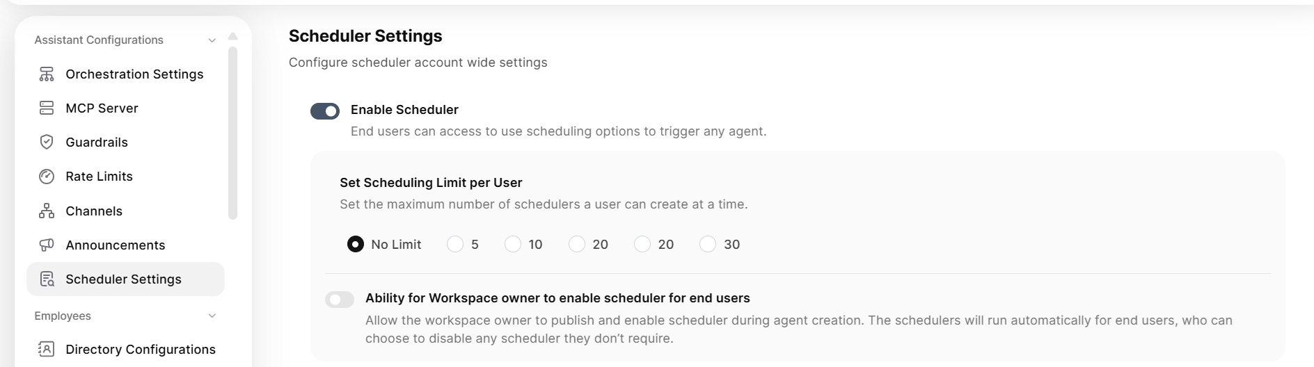 Scheduler Settings allow administrators to configure account-wide controls for automated agent execution. These settings determine scheduler availability, usage limits, and workspace-level permissions across the organization.