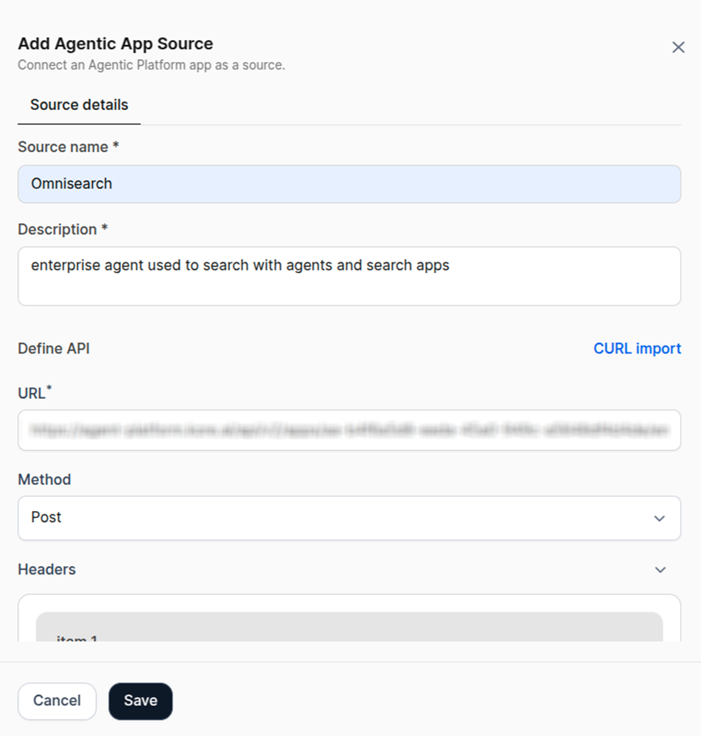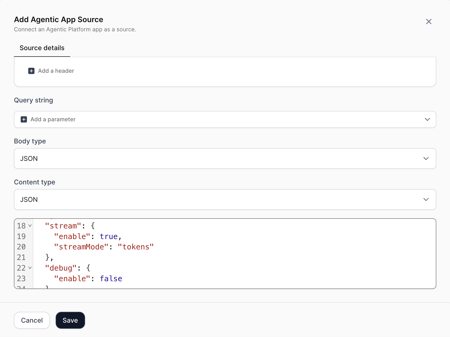 Inside the Add Agentic App Source window, scroll to the JSON body and modify. This activates real-time token-level streaming so users can see responses as they generate.