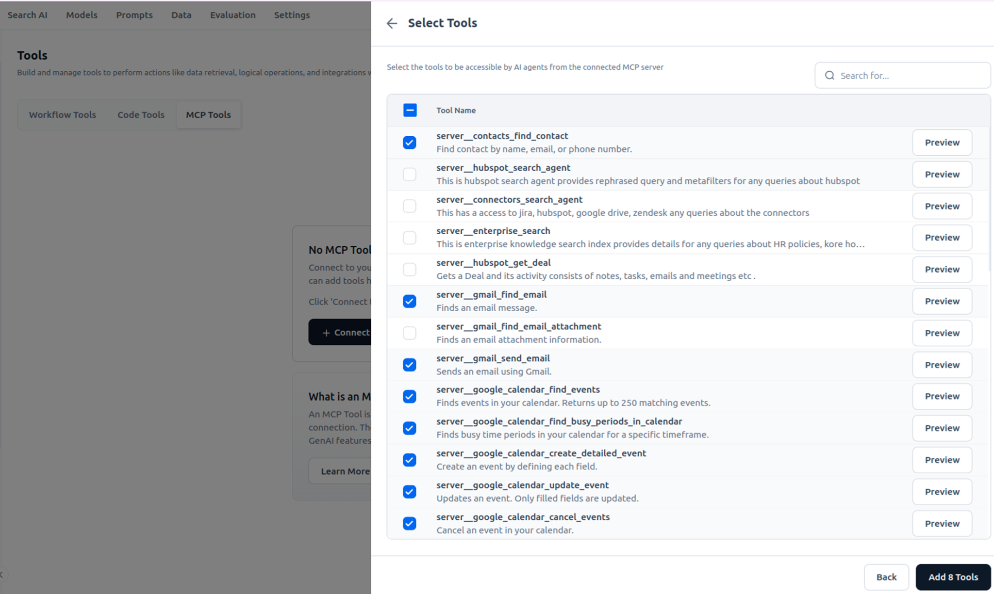 After saving your MCP tool configuration, you'll enable specific tool integrations through the Tool Selection interface. Agentic Search supports various productivity tools, including Google Workspace connectors for contact lookup, email management, and calendar operations.