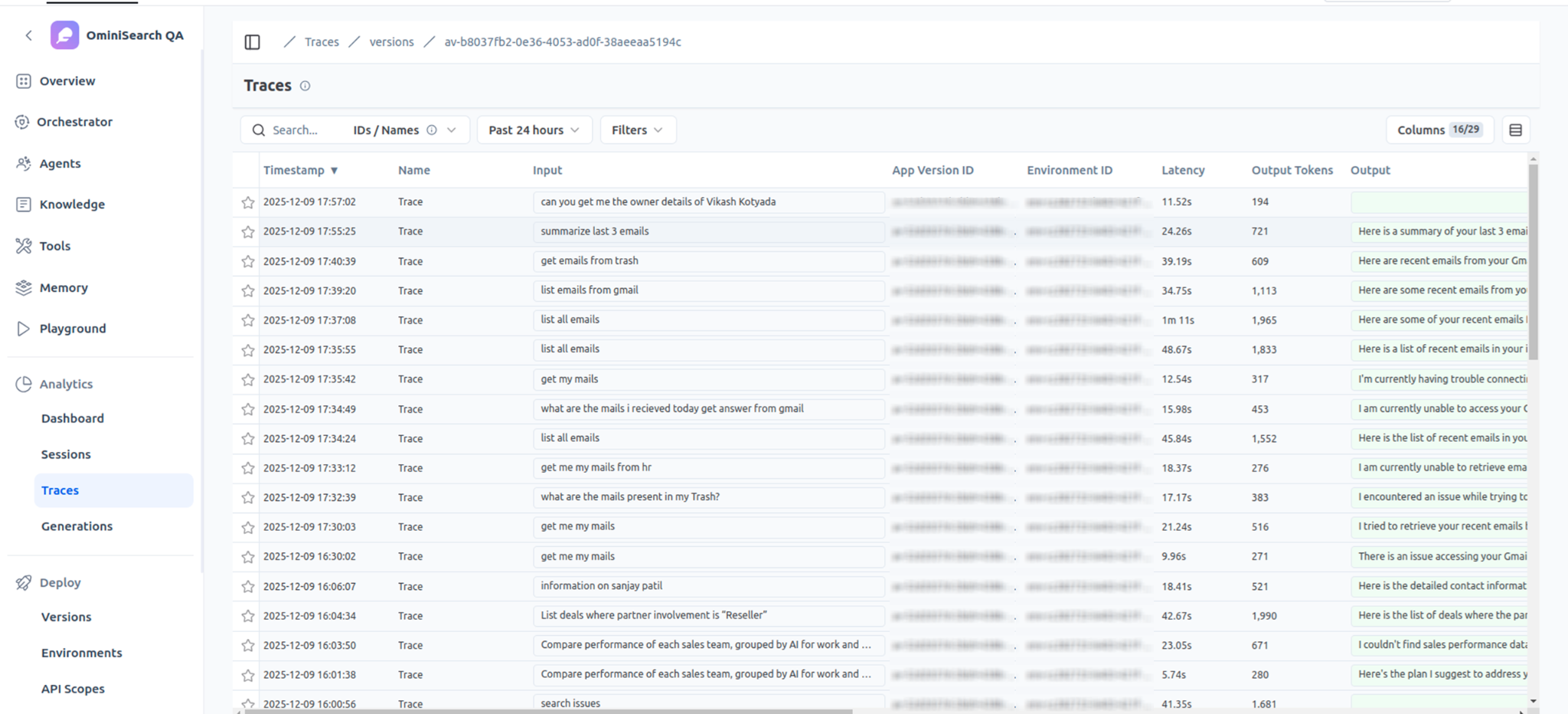 The traces show how your query moved through the agent architecture, which tools were invoked, and how the response was generated. Use this diagnostic view to troubleshoot any issues.