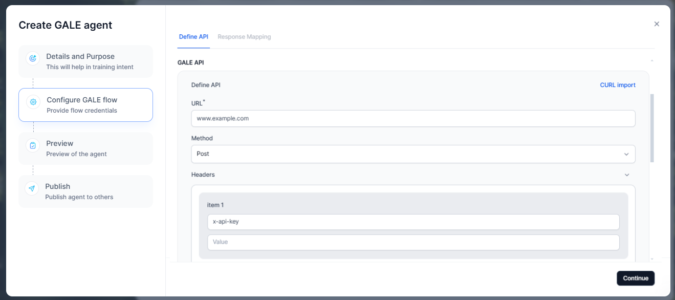 In the API key value field, paste the key that you have copied from the Workflow Agent and click Continue.