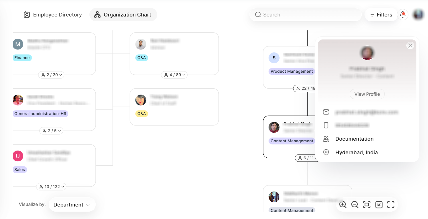 - Full View: Opens the Organization Chart in full-screen mode. All interactions like expand, zoom, filters, and search remain available in full view.