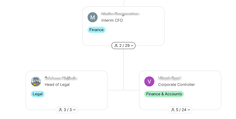Filters applied on the Organization Chart highlight only the cards that match the filter criteria. Non-matching cards remain visible in a disabled state to preserve hierarchy context, but are not interactive.