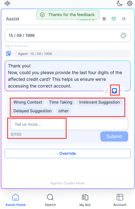 - Context-Specific Feedback: Configure up to six predefined negative feedback messages for Agentic Feedback, Dialog Tasks, Answers, FAQs, and Summaries, but turn on only five per subsection at a time. To turn on a sixth, you must first turn off another. These options appear in the widget after agents select the thumbs-down icon in the Agent AI widget. You can edit these messages (limited to 25 words each), include a comment box for any additional input, and set the display language.