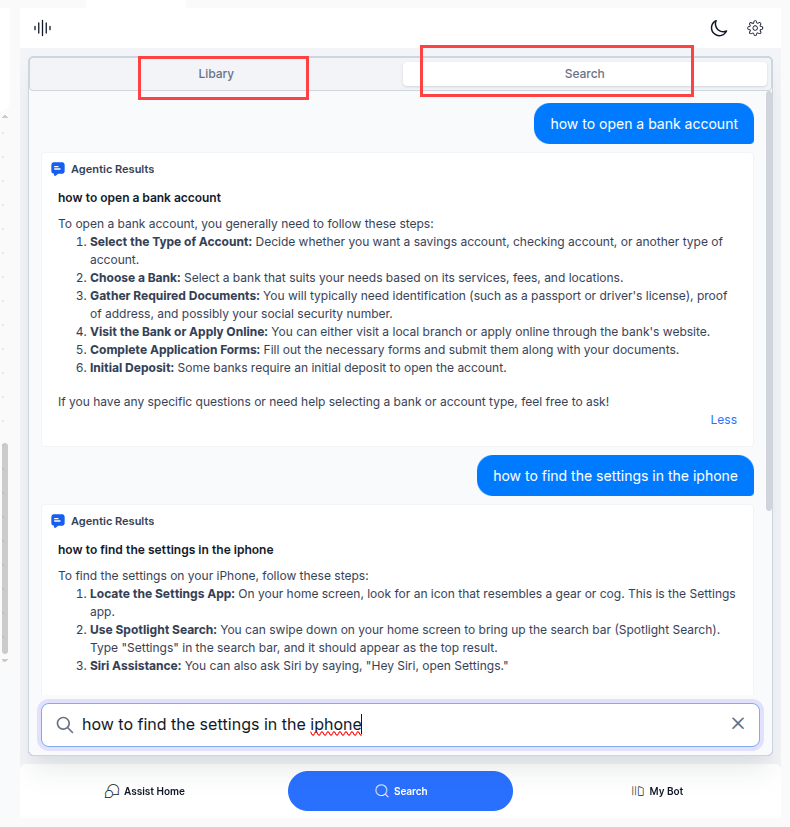 - When you select Conversational Search, the widget shows the Library and Search tabs. By default, the Library tab displays the existing dialog tasks. When you enter a query or select the Search tab, results appear under the Search tab, and previous searches remain visible. The following screenshot shows the search results in the Conversational Search option: