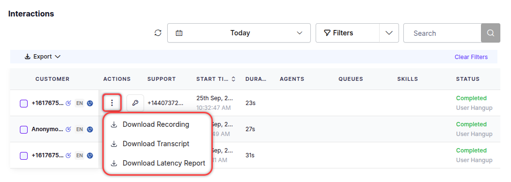 Export/Download Recording, Transcripts, Latency Report, and Events¶