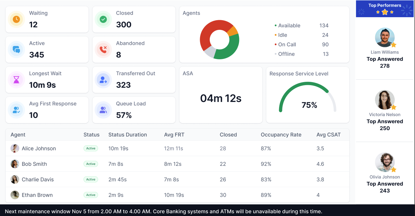 Name Range Description Top N Closed N in the range of 1–3 Shows agents with the highest number of closed conversations. Top N Answered N in the range of 1–3 Shows agents with the highest number of accepted conversations. Top N CSAT N in the range of 1–3 Shows agents with the highest CSAT. Top N Occupancy Rate N in the range of 1–3 Shows agents with the highest occupancy rate. Top N Average First Response Time N in the range of 1–3 Shows agents with the lowest Average First Response Time (FRT). -