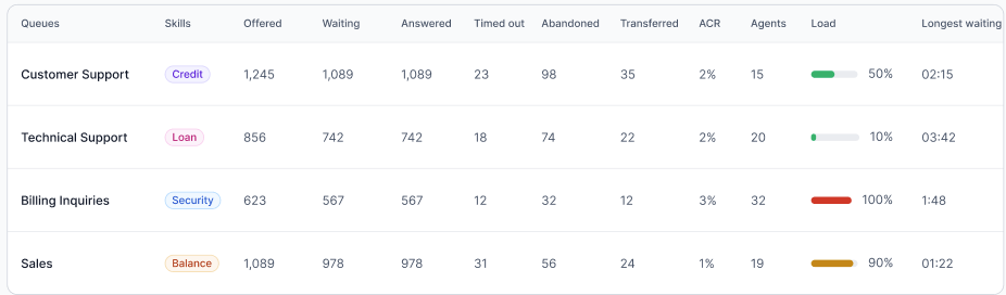 | Load | Live | Queue load calculated using the queue load formula from the Queues and Agents dashboard. Skills are ignored for this metric. |