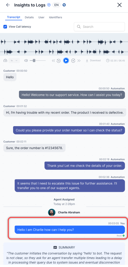 - Events are recorded periodically, so the exported document may not always reflect the entire event history. For a comprehensive record, it is recommended to download the events once the conversation has ended.