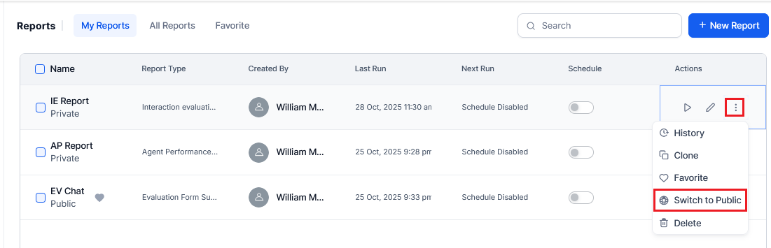 This allows you to control a report’s visibility to specific groups or individuals by toggling its status between public and private. You can restrict the accessibility of the reports as required. There are two permissions available:
