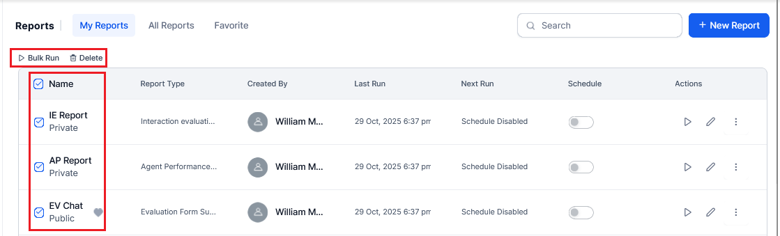 Bulk Operations: Allows you to search, filter and select reports in bulk for batch actions.