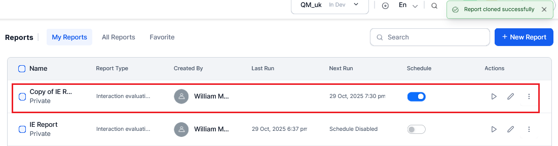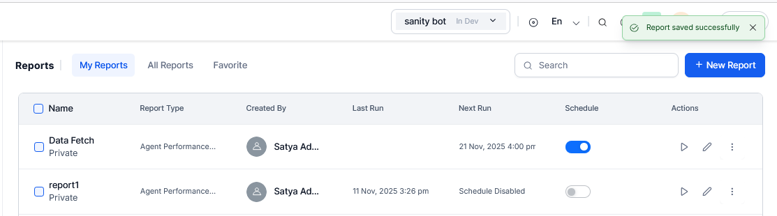 The report is saved and appears in the My Reports - Reports dashboard according to the defined configuration and schedule.