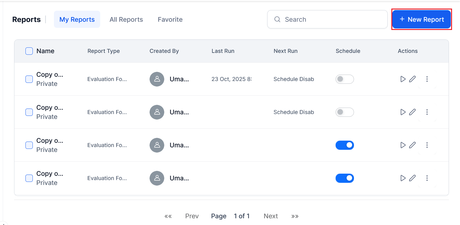 | My Reports | Displays only the reports created by the current user. Provides quick access to run, edit, or schedule them. |