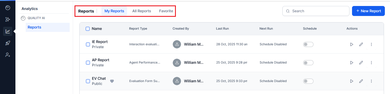 Navigate to Quality AI > Analytics > Reports > + New Report.