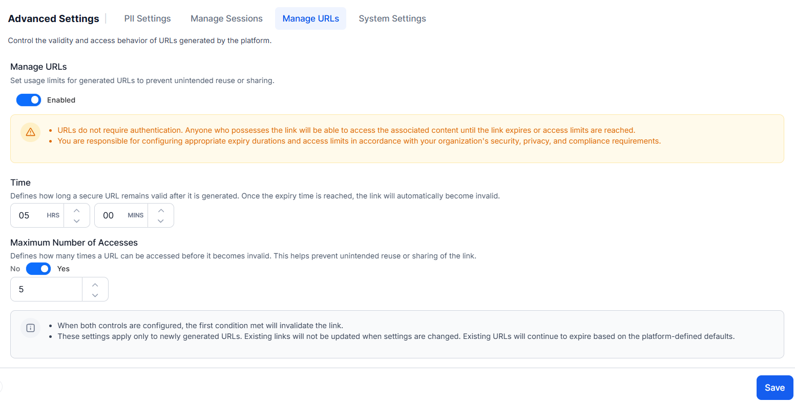 - Enable the toggle under Manage URLs. This allows you to configure expiry time and access limits for newly generated URLs.