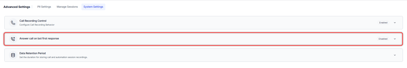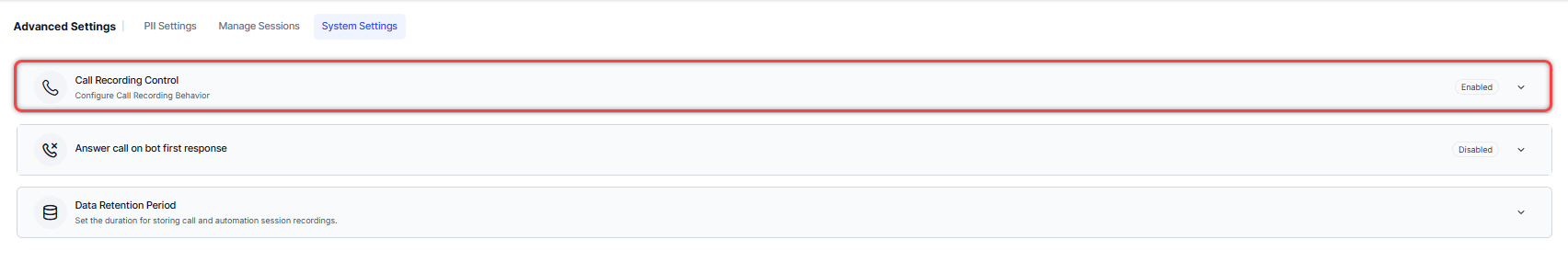 The System Settings allow administrators to configure key platform features that control call handling, data management, and system behavior. From this section, administrators can manage Call Recording Control, configure whether calls are answered on the first Bot or AI Agent response, and set the Data Retention Period for stored information. These settings ensure consistent system operation, compliance with policies, and efficient handling of conversations.