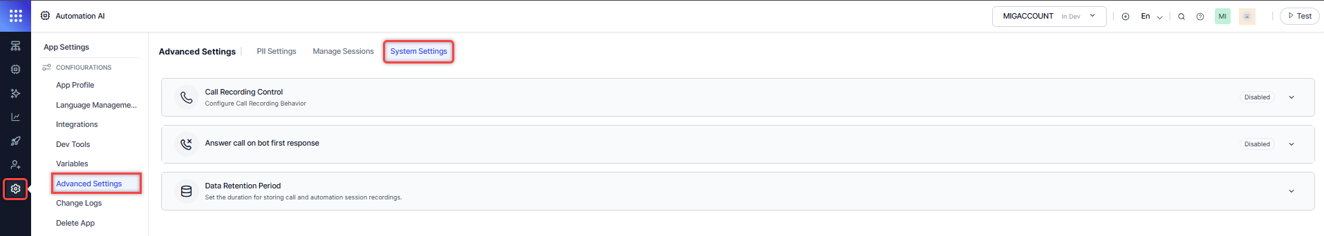 Go to Automation AI > App Settings > Advanced Settings > System Settings to access and configure these functionalities.