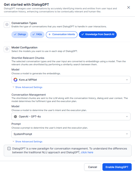 - Click Enable DialogGPT. The DialogGPT home page is displayed.
