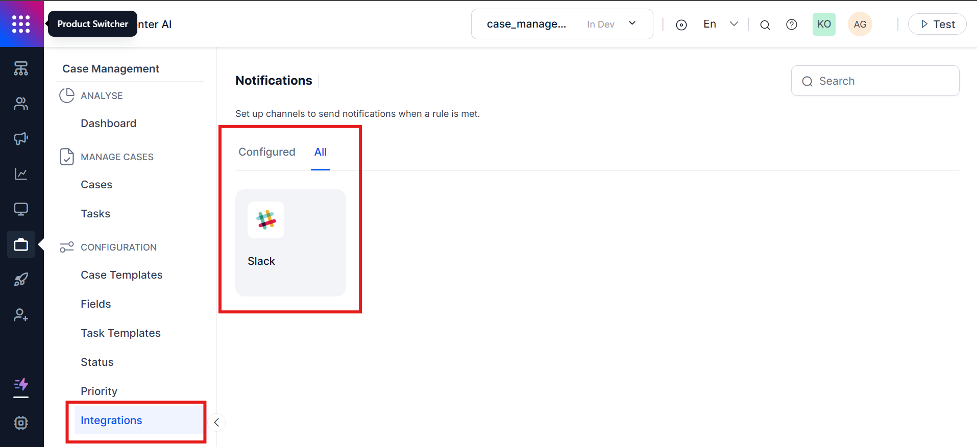 - Navigate to Contact Center AI > Case Management > Configuration > Priority and select All. This displays all the apps available to integrate.