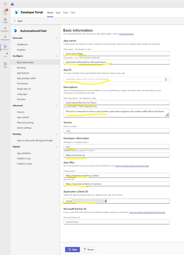 Enter the required App Details, ensuring the Microsoft App ID is identical across Azure, Platform, and the Developer Portal, and that all fields are completed to prevent errors during zip file creation.