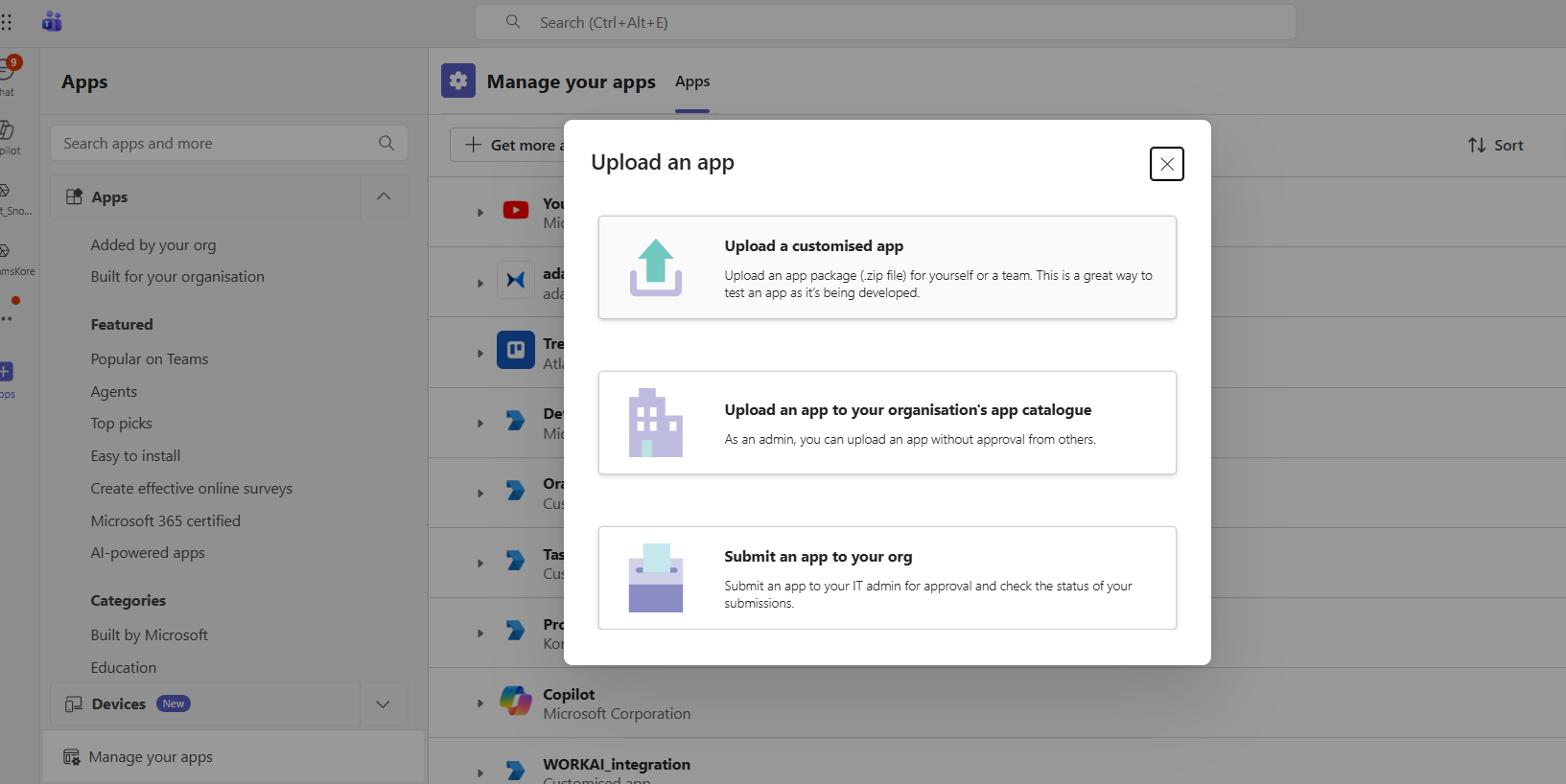 Upload the App into Teams: Go to Teams → Apps → Manage your Apps → Upload a Custom App by clicking on the “Upload an app” option → Select the ZIP file.