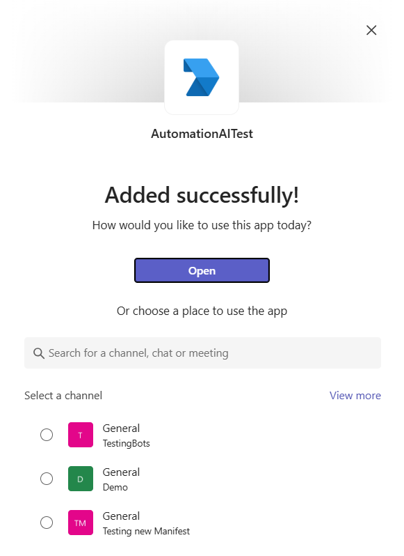 Add and Test the App. Click Add, open the app, and test your app in Teams.