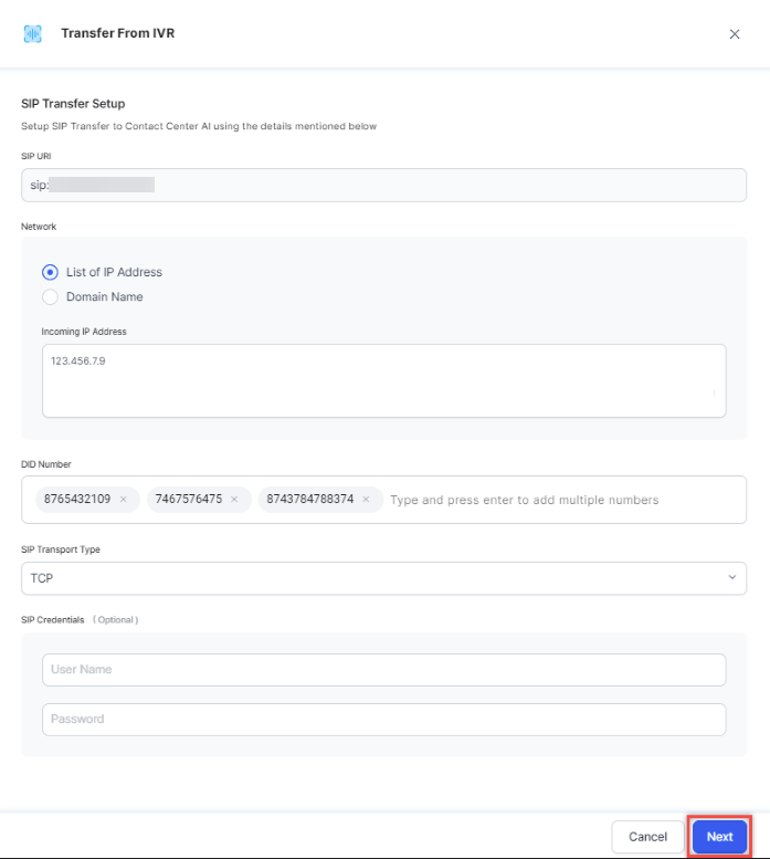 Under the SIP Trunk tab, you can configure the network IPs and domains, DID number, SIP transport protocol, SIP credentials (optional), and Inbound/Outbound direction for phone numbers while the SIP URI is pre-configured.