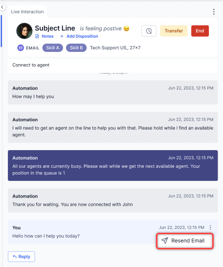 Agents can view customers' real-time sentiments during conversations (Chat, Voice, and Email) on the Conversation Tray and the Live Interactions pane. Administrators can enable the real-time sentiment capture functionality. Learn more.