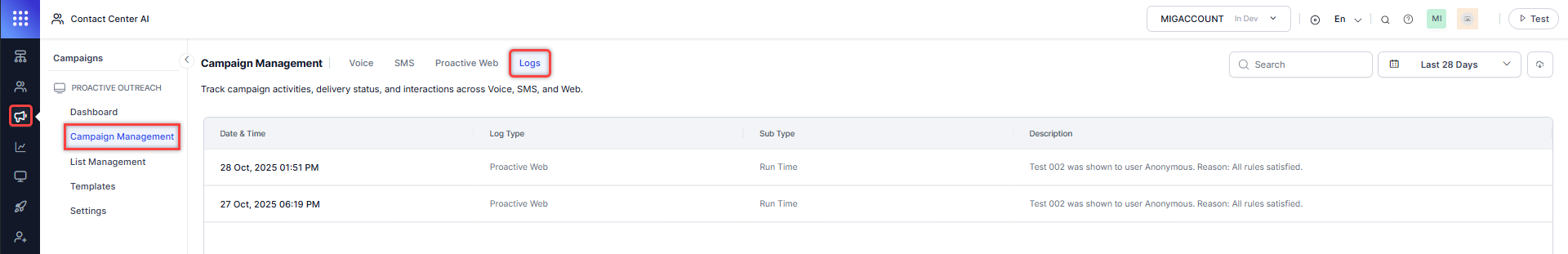 The Logs enables users to view and manage event logs for web campaigns. It provides visibility into campaign executions, display statuses, and reasons for campaign behavior. The feature helps supervisors monitor campaign activity, troubleshoot issues, and analyze campaign effectiveness.