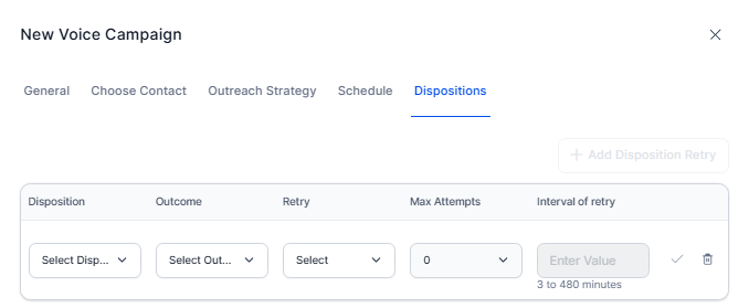 The dispositions tab defines the retry mechanism for dispositions considered as not fully attempted.