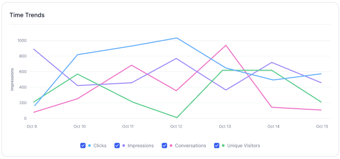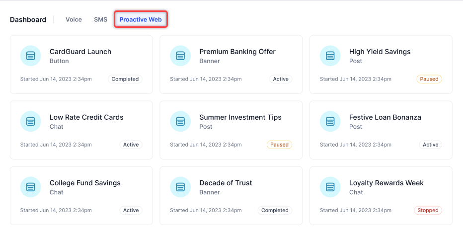 The Proactive Web Campaigns Dashboard provides metrics based on website visitor behavior. It supports filtering by campaign executions and date range for analysis.
