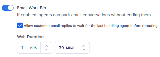 The Email Work Bin setting lets agents park email conversations without ending them. Turning on this setting enables agents to set aside email interactions and resume them later temporarily.