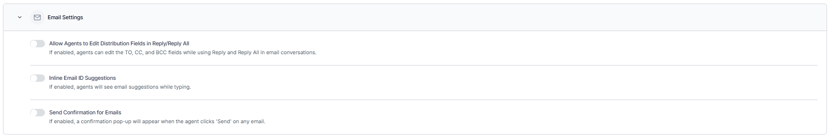 • The Inline Email ID Suggestions setting displays contact suggestions while agents type.