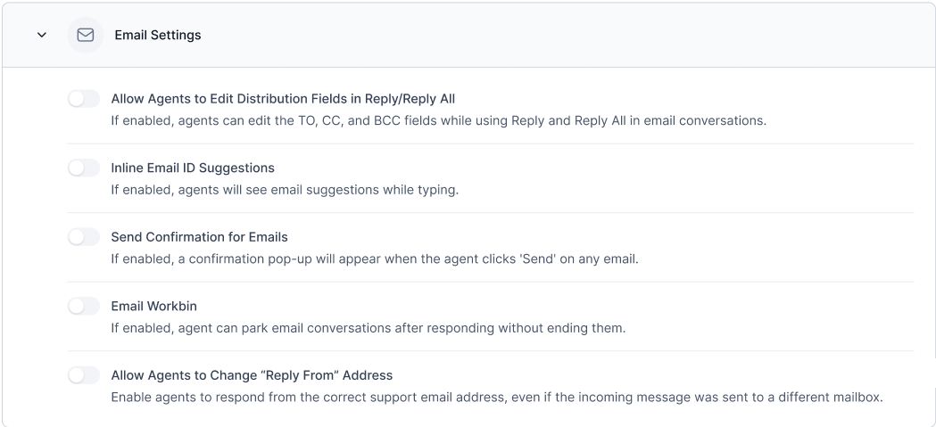 Agents can add or remove recipients in the To, CC, and BCC fields, while organizations control whether to enable this capability. This flexibility helps contact centers maintain compliance by restricting edits where required or allowing them when needed. The Email Settings group contains all general email configuration options.