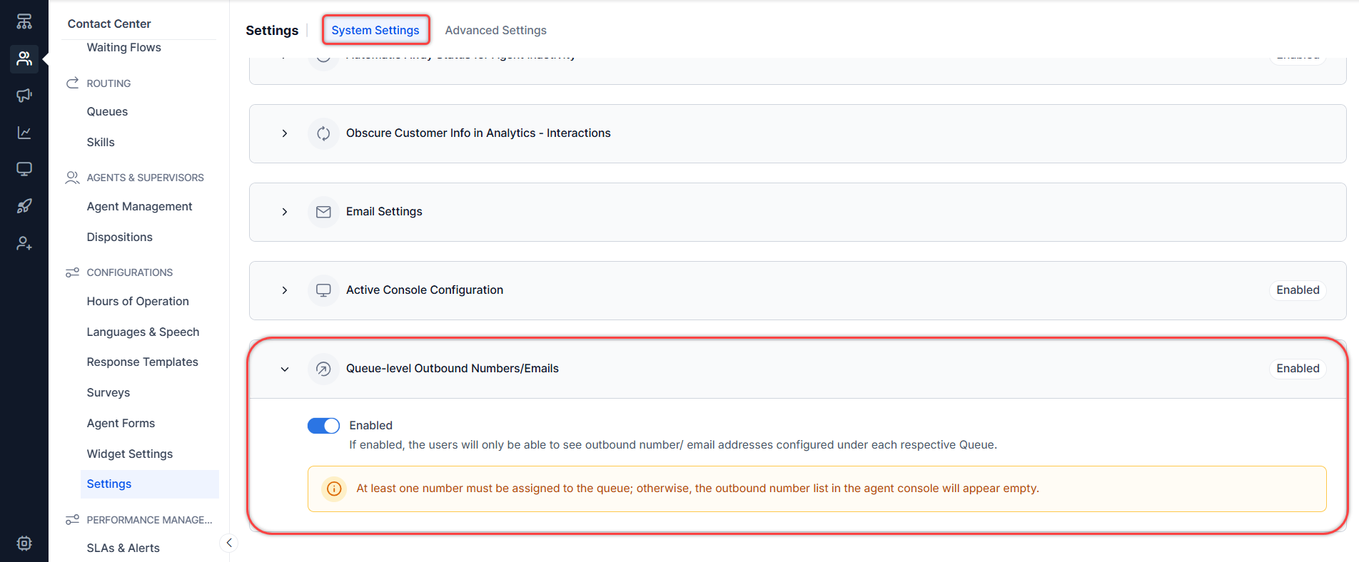 Navigate to Contact Center AI > Configurations > Settings > System Settings > Queue-level Outbound Numbers or Emails.