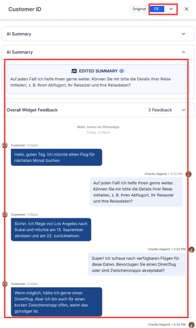 The Conversation Logs section also provides a language dropdown list. You can view content in the original language, translated language, or both side by side. You can also translate the content in another available language, if Agent AI Conversation Logs is enabled in the Contact Center AI > CONFIGURATIONS > Settings > Advanced Settings > Translation Configurations section.