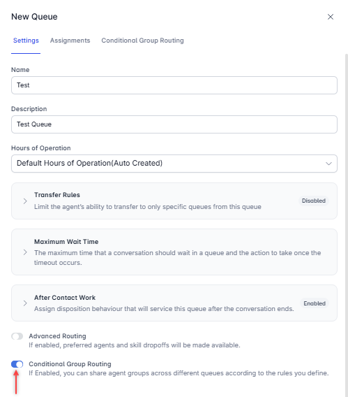 Administrators can configure CGR rules in the routing settings of a queue by turning on the toggle.