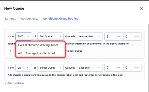 - Queue A (QA): A new conversation arrives. QA’s Estimated Wait Time (EWT) = 5 minutes.