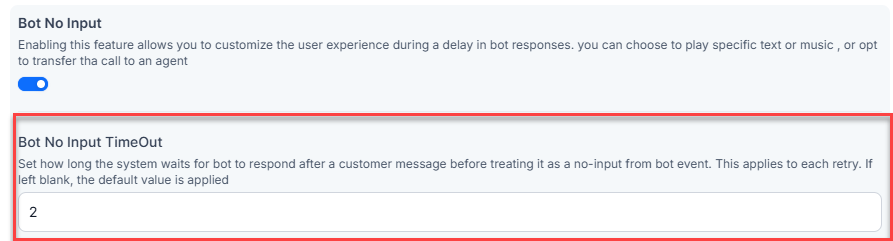 Bot No Input URL: Enter a valid audio URL. The bot will play the audio file from this URL when triggered by the no-input timeout.